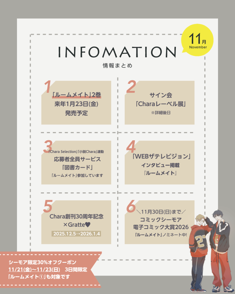 「Chara Selection」「小説Chara」連動 の応募者全員サービスの図書カードのラインナップに今回も参加させていただきました。詳しくはこちらをご覧ください。